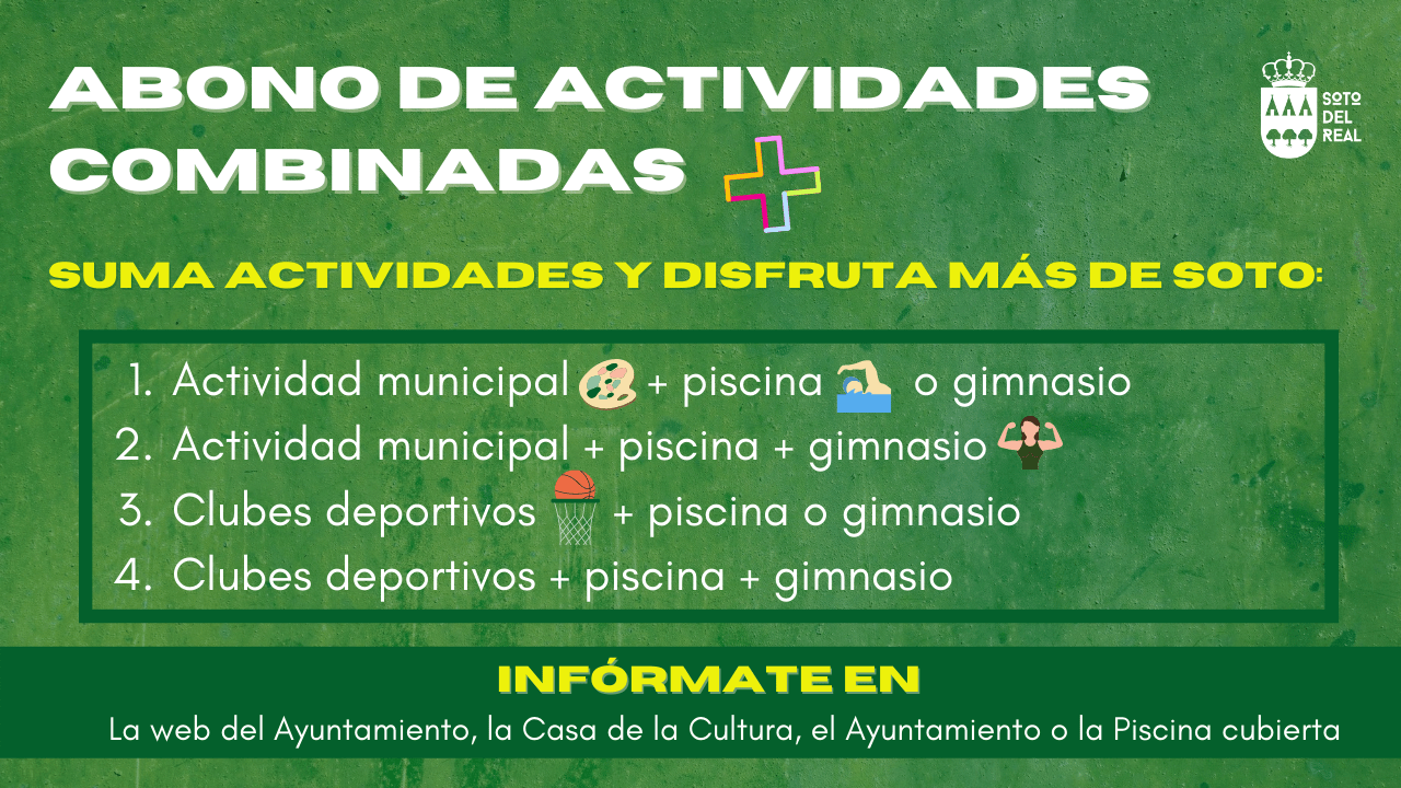 – Súper Abono Actividades Municipales + Piscina o Gimnasio: Combina 1 o varias actividades municipales con acceso a la Piscina Cubierta o Gimnasio Municipal con una importante bonificación sobre la tarifa ordinaria.
