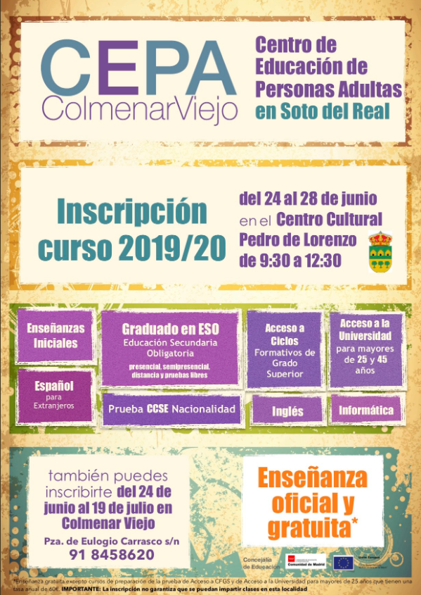 INSCRIPCIONES: del 24 al 28 de junio en la Casa de la Cultura de Soto del Real de 9:30h a 12:30h.