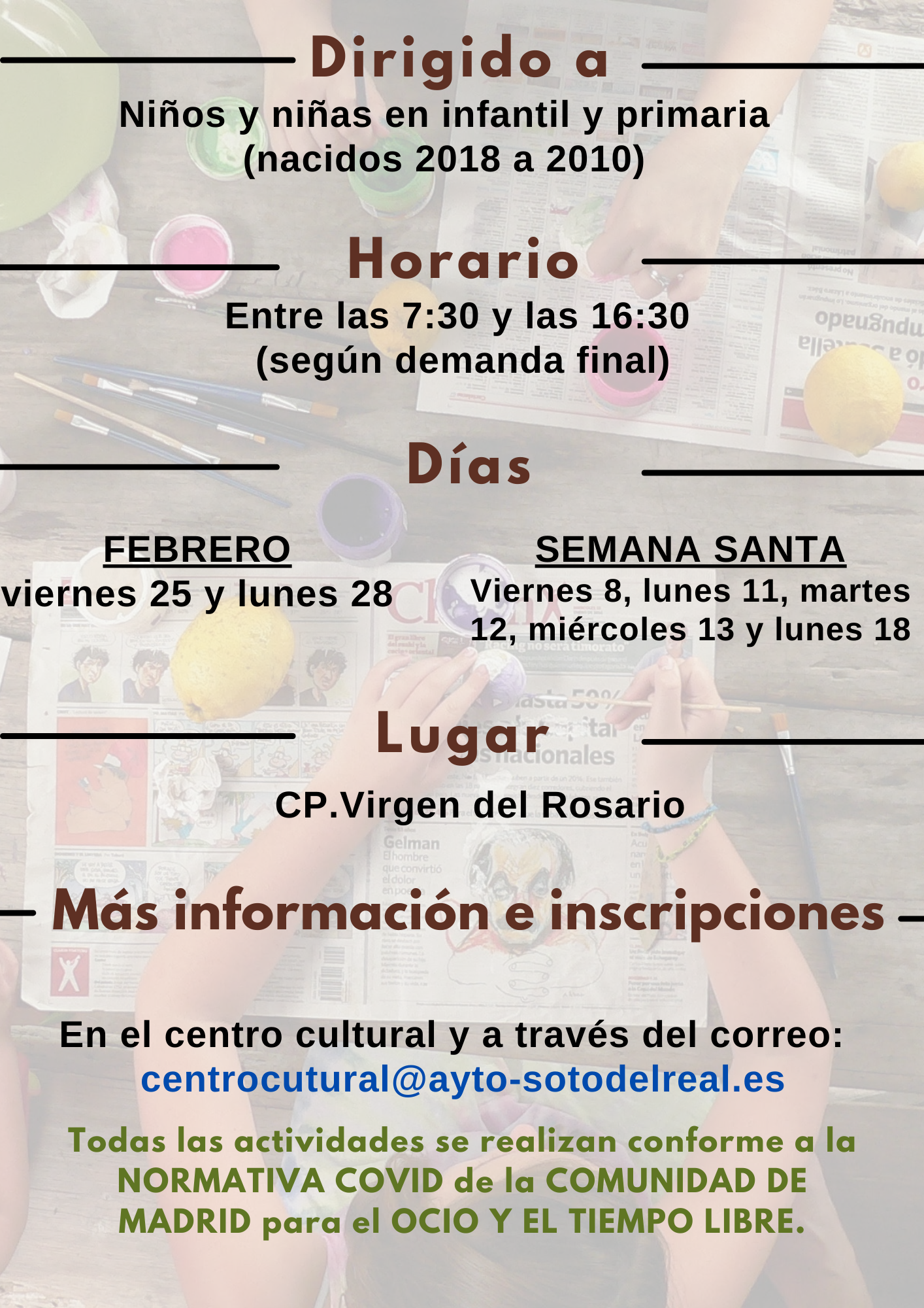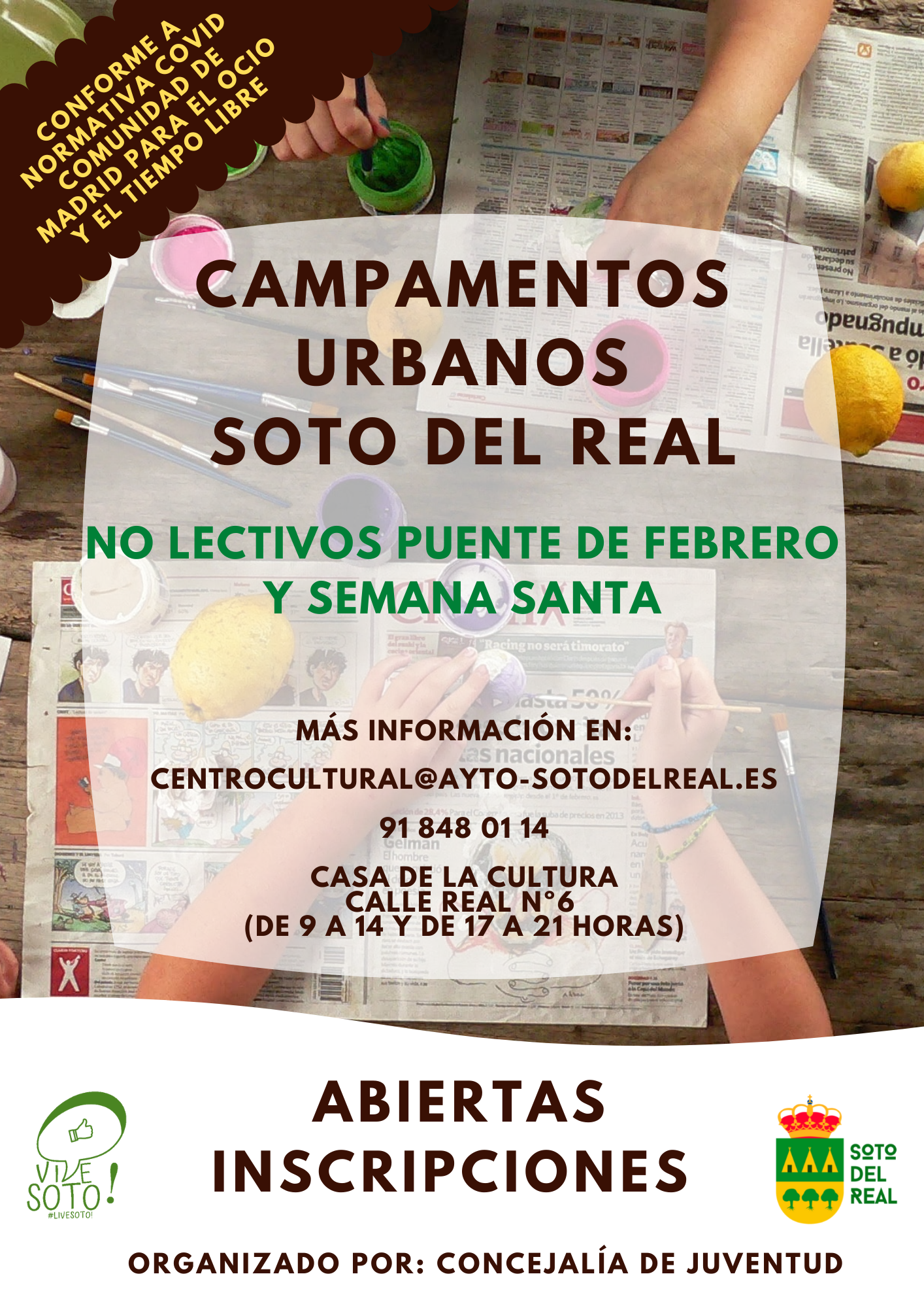 Las inscripciones pueden ser descargadas aquí deben realizarse en el Centro Cultural o mediante el correo electrónico centrocultural@ayto-sotodelreal.es , pudiendo seleccionarse días sueltos o todos los días.