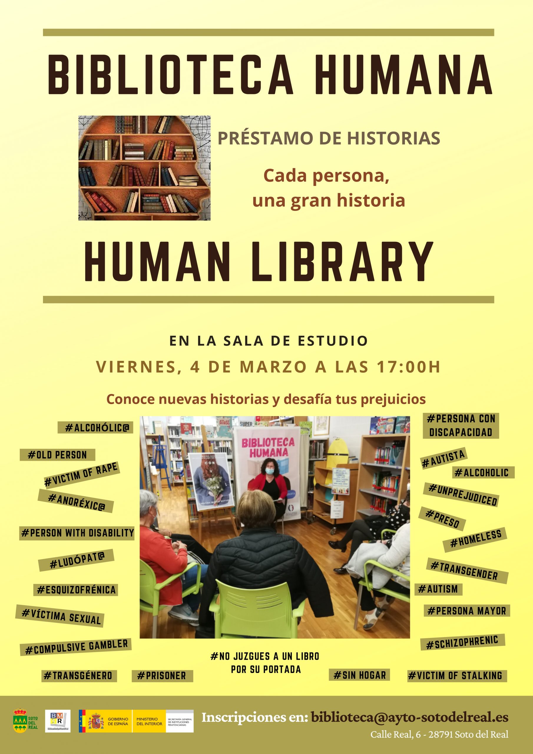 La Biblioteca Municipal de Soto del Real junto al Centro Penitenciario Madrid V organizan la primera sesión de Biblioteca Humana dentro del proyecto Libros que Saltan Muros el viernes 4 de marzo de 17:00 a 19:00 h en la Sala de Estudio de la biblioteca.