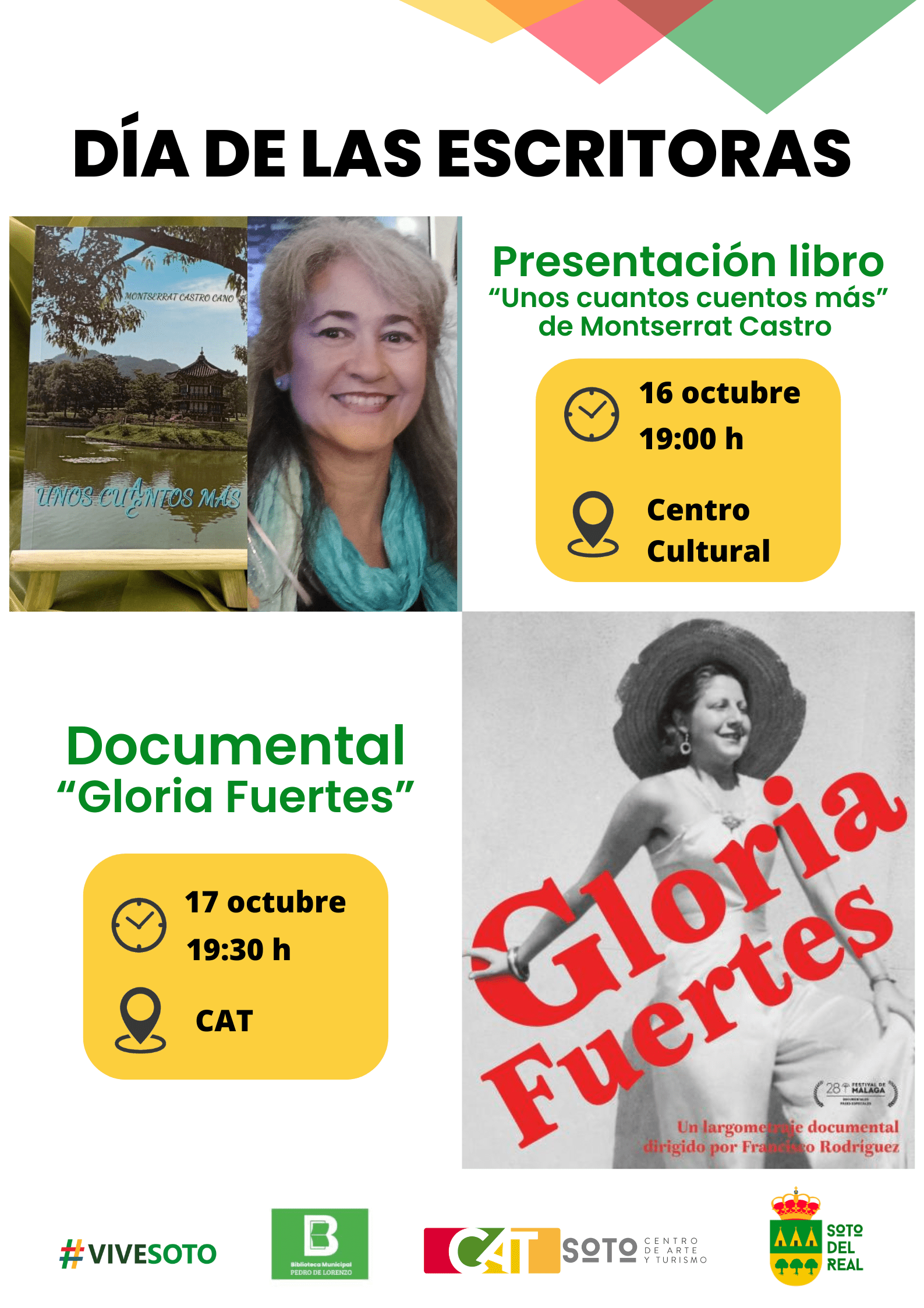 - Soto del Real conmemora el Día de las Escritoras con dos citas culturales imprescindibles: el jueves 16 de octubre se presentará el libro Unos cuantos cuentos más y el viernes 17 se proyectará el documental Gloria Fuertes, con coloquio junto a su director.