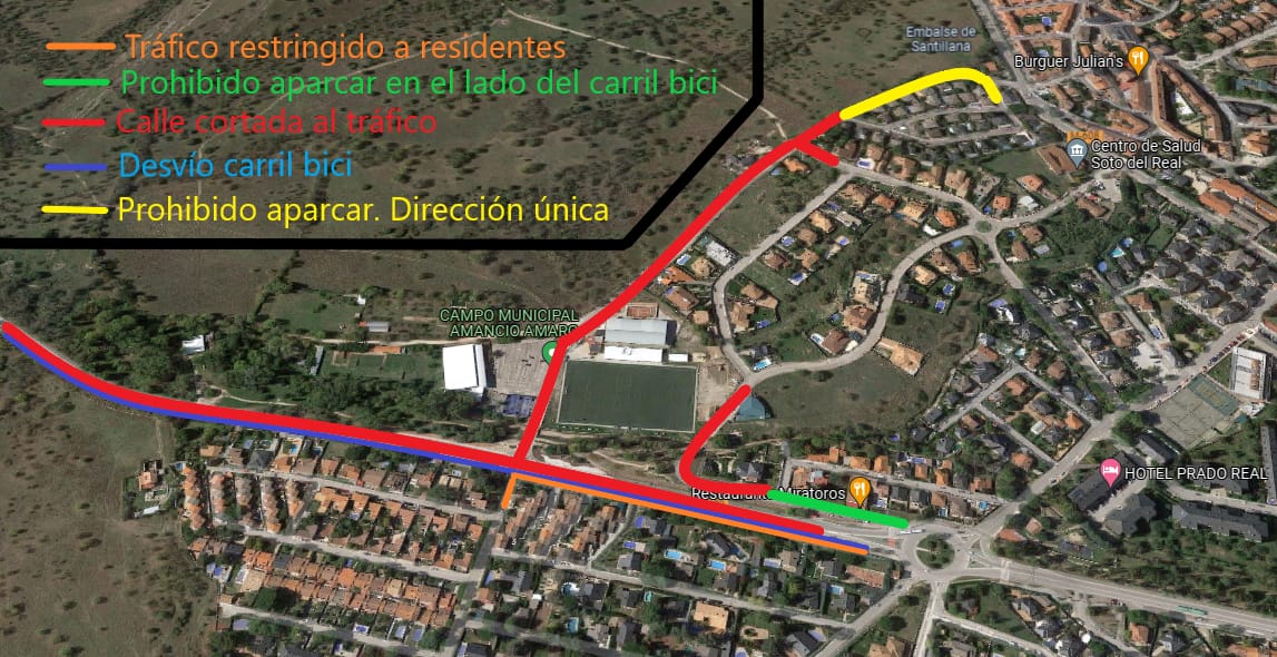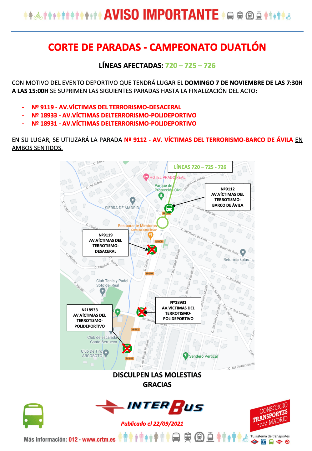 Entre las 7:30 y las 15:00h se suprimen las 3 primeras paradas de autobús de Soto del Real entrando desde Colmenar. En su lugar se utilizará la parada situada frente a la rotonda de la bandera dirección Miraflores. Está será utilizada para coger el autobús en ambos sentidos. En concreto se suprimen las siguientes paradas: