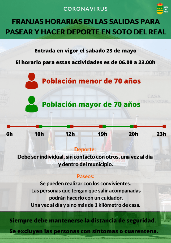 23 de mayo 2020. El Ayuntamiento de Soto del Real flexibiliza las franjas horarias para paseos y deporte individual dentro del municipio desde el día de hoy, 23 de mayo de 2020.