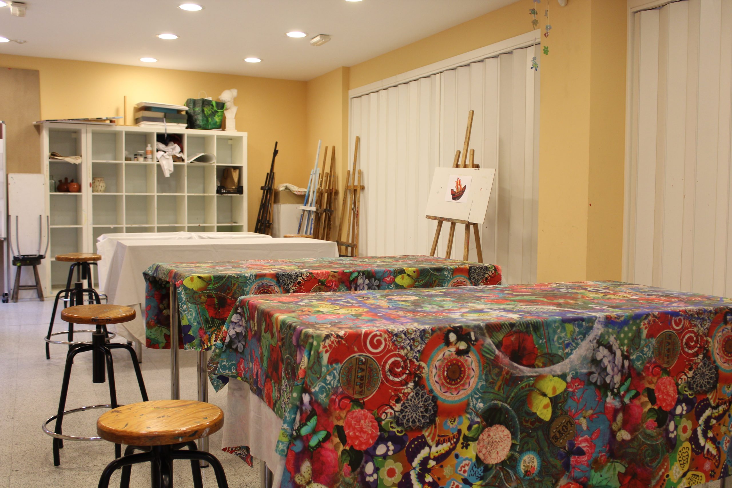 -Sala para talleres creativos: dispone de mesas de trabajo y taburetes, así como caballetes para proyectos artísticos.