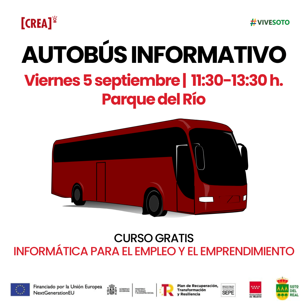 El viernes 5 de septiembre, te esperamos en los aparcamientos del Parque del Río, donde un autobús informativo te dará todos los detalles sobre el curso gratuito de informática para el empleo y el emprendimiento para mujeres.
