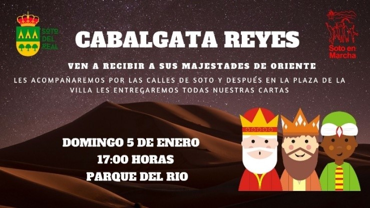 Ven a recibir a Sus Majestades los Reyes Magos de Oriente. La Cabalgata recorrerá las calles del pueblo y acabará en la Plaza de la Villa, donde Sus Majestades recogerán las cartas de todos los niños y niñas