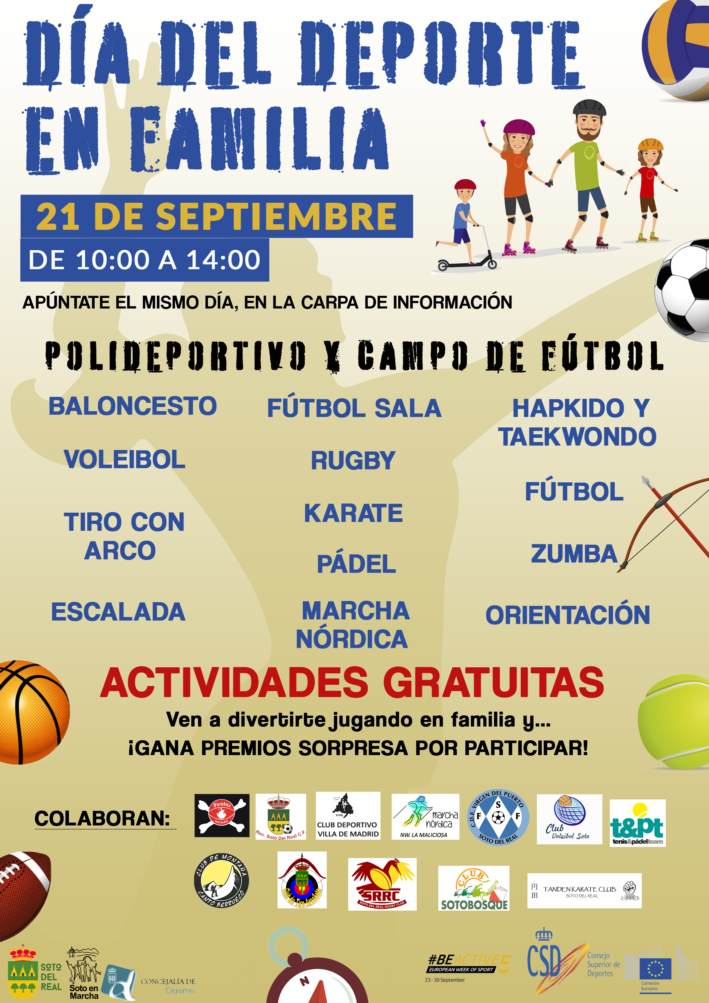 El sábado 21 de septiembre se celebra el Día del Deporte en Familia (enclavado en la Semana Europea del Deporte 2019), en donde adultos y niñ@s podrán disfrutar de forma gratuita de multitud de actividades deportivas junto a su familia o amigos: Baloncesto, Fútbol, Escalada, Fútbol Sala, Rugby, Tiro con Arco, Pádel, Taekwondo, Voleibol, Marcha Nórdica, Tenis, Gimnasia Acuática Familiar, CroosGym, Zumba,… y ganar. PREMIOS SORPRESA POR PARTICIPAR.