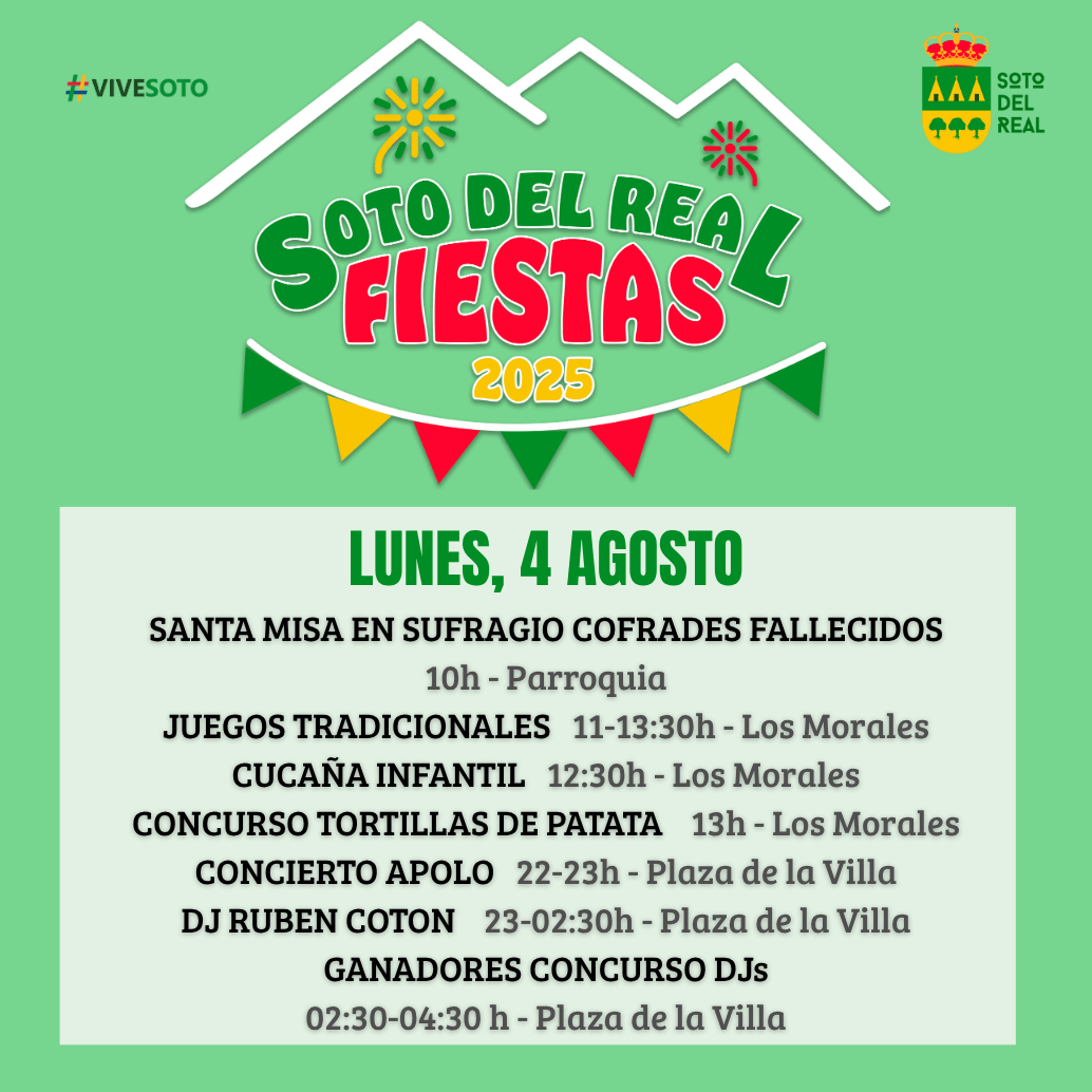 • Concurso de tortillas de patatas – 13:00 h. Los Morales. Organizado por la Asociación Mujeres Soto en femenino. Inscripciones a través del correo produccioneventos@ayto-sotodelreal.es o 1 hora antes en la carpa de Los Morales. El premio será una caja de experiencias para dos personas.