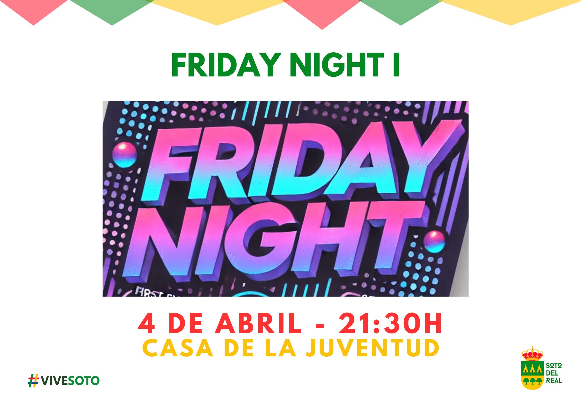 💡 FRIDAY NIGHT es un ciclo de 4 eventos nocturnos saludables que nace de la propuesta de un grupo de jóvenes de Soto del Real, que han trabajado mano a mano con la Concejalía de Juventud para hacerlo realidad. 🙌 Tú también podrás participar y ayudarnos a diseñar las siguientes actividades.