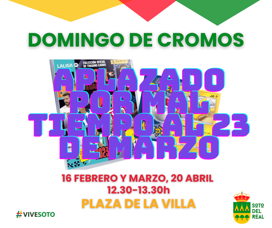 ¿Tienes cromos repetidos de Pokémon, LaLiga u otras colecciones? ¡Este es el momento de completarlos! Te esperamos el domingo 19 de enero, de 12:30 a 13:30 h, en la Plaza de la Villa de Soto del Real para un divertido intercambio de cromos.