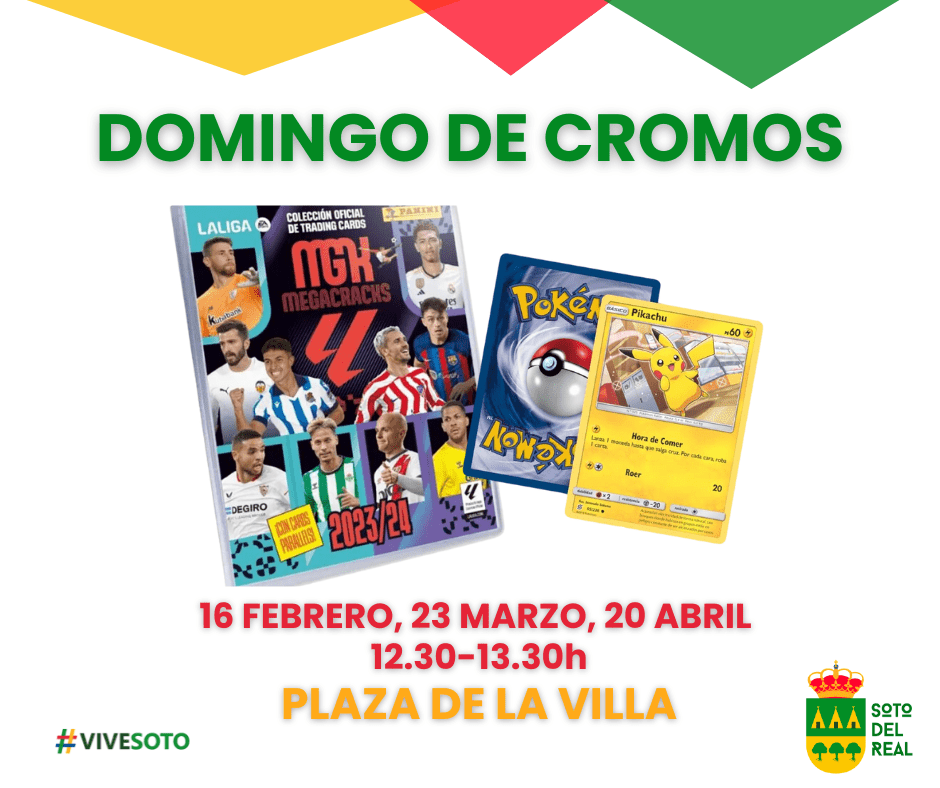 ¿Tienes cromos repetidos de Pokémon, LaLiga u otras colecciones? ¡Este es el momento de completarlos! Te esperamos el domingo 19 de enero, de 12:30 a 13:30 h, en la Plaza de la Villa de Soto del Real para un divertido intercambio de cromos.