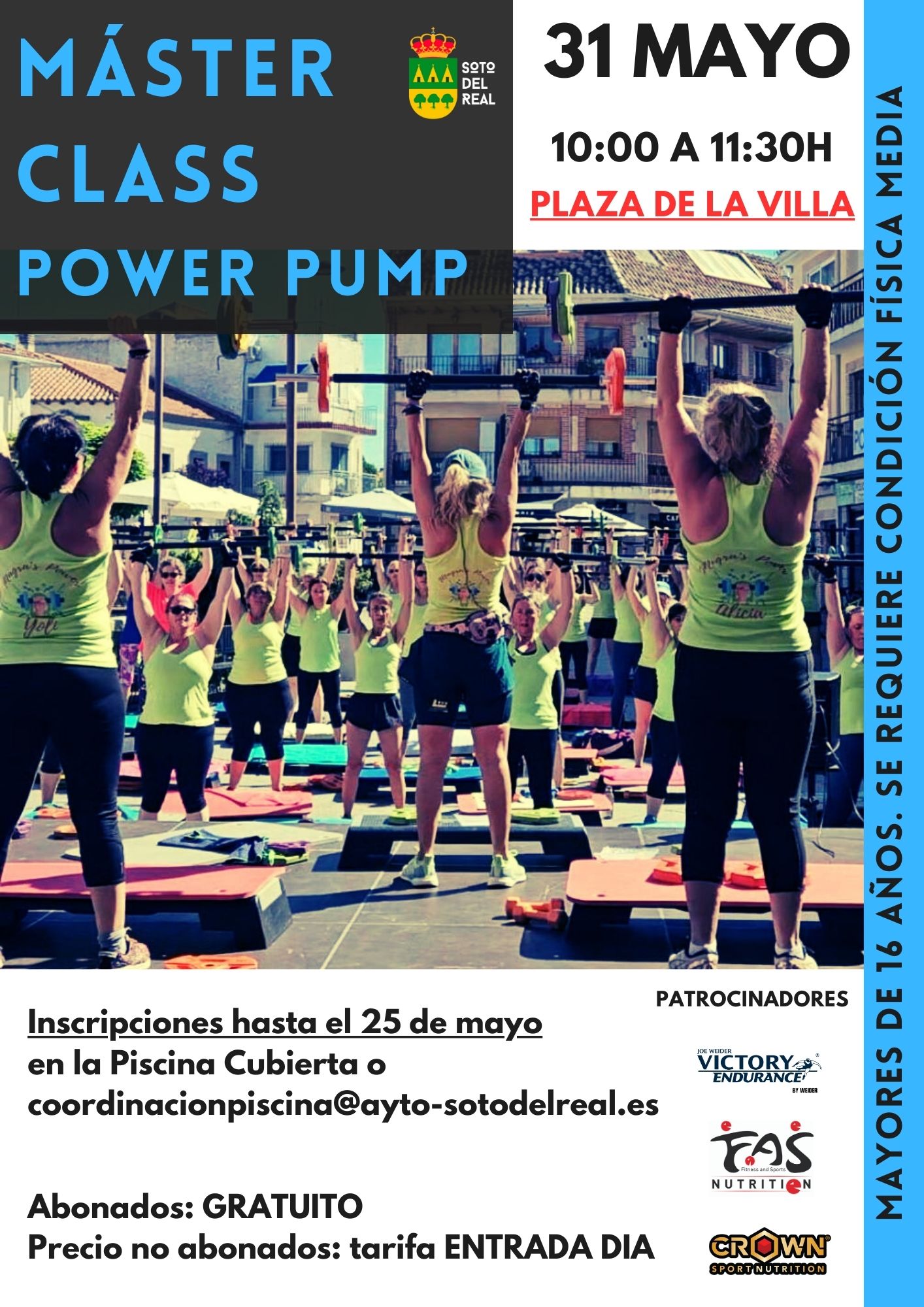 INSCRIPCIÓN: Inscripción previa obligatoria, hasta el 25 de mayo (o agotar plazas), en la Piscina Cubierta o a través del correo infopiscina@ayto-sotodelreal.es