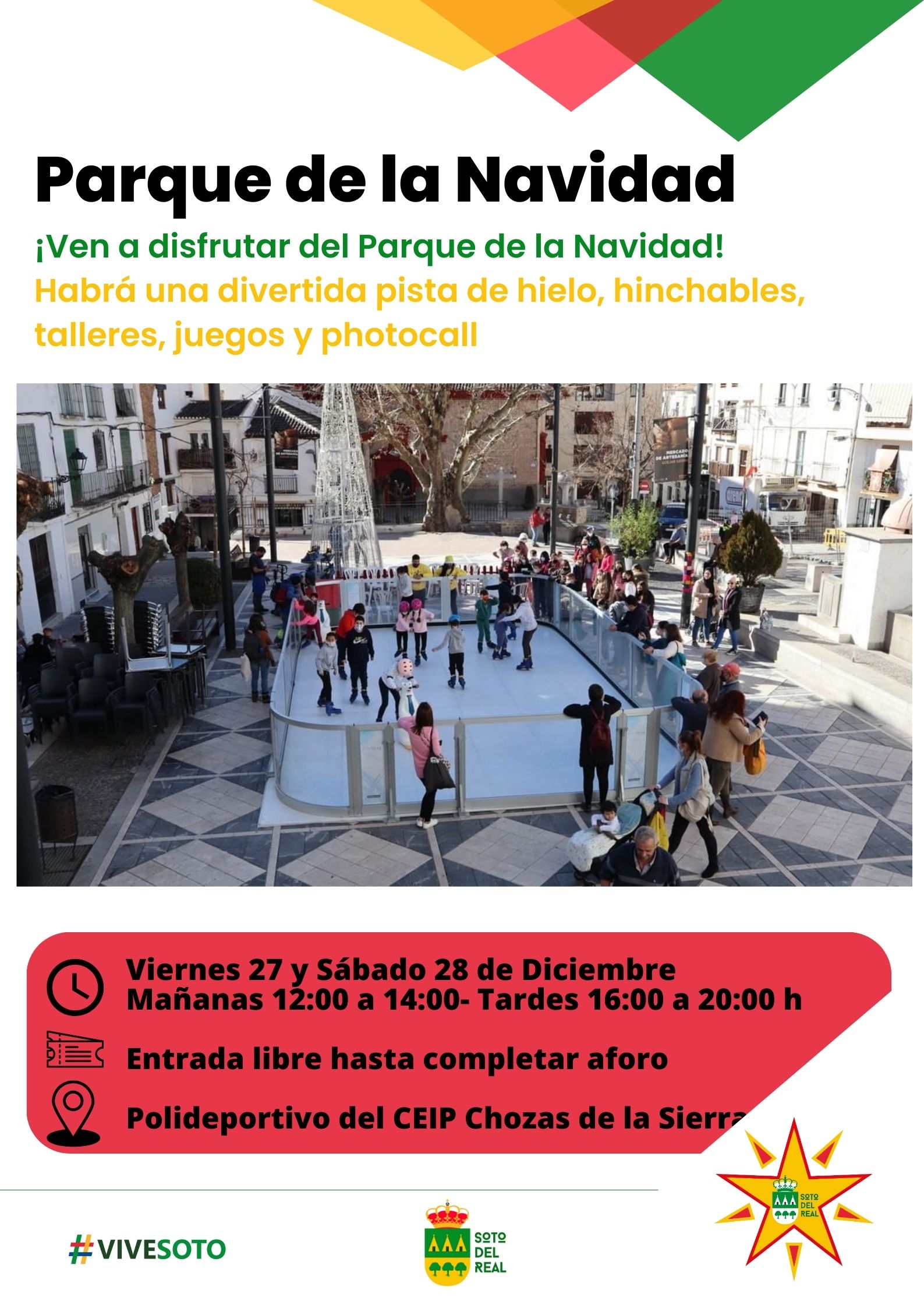 Este año el Parque de la Navidad cambia de ubicación al Colegio Chozas de la Sierra. Tendrá una divertida pista de hielo, hinchables, talleres, juegos y photocall.