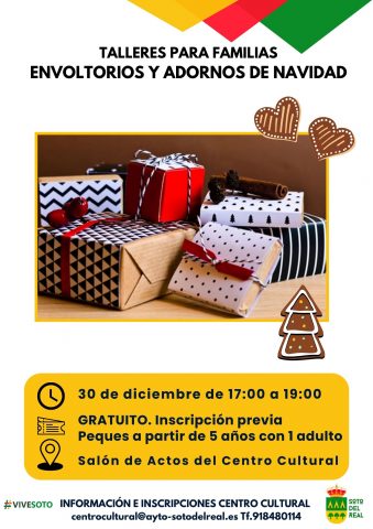 DÍA: 30 de diciembre; HORA: 17:00 a 19:00 h; LUGAR: Centro Cultural; INSCRIPCIONES: gratuitas en el Centro Cultural; PÚBLICO: A partir de 6 años, niño/adulto. (20 personas máx).