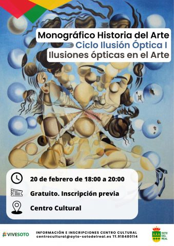 TÍTULO DEL EVENTO: Ciclo Ilusión Óptica I. Ilusiones ópticas en el Arte. TIPO DE ACTIVIDAD: Monográfico Historia del Arte FECHAS: 20 de febrero HORA: 18:00 a 20:00h. LUGAR: Centro Cultural PRECIO: Gratuito Ilusiones ópticas a través del arte de todos los tiempos, el juego de la percepción en las obras pictóricas, cómo los artistas utilizan […]