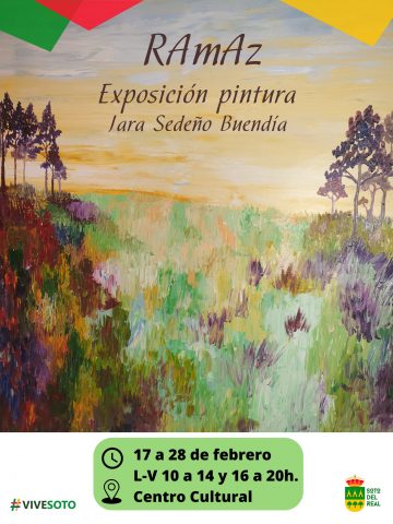 DÍA: 17 al 28 de febrero; HORA: apertura del Centro Cultural; LUGAR: Sala de exposiciones del Centro Cultural; ENTRADA: gratuita hasta completar aforo. "RAmAz" Exposición de pintura al Oleo, Jara Sedeño Buendía , cuadros de escenas de la vida cotidiana y paisajes , realizados en oleo sobre lienzo o tabla con espátula.