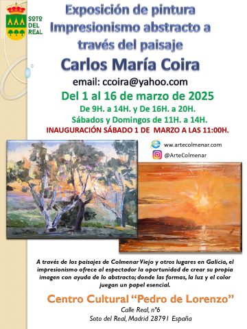 DÍA: Del 1 al 16 de marzo; HORA: horario Centro Cultural; LUGAR: Sala de Exposiciones del Centro Cultural; PRECIO: gratuito. Exposición de pintura de Carlos Mª Coira. A través de los paisajes de Colmenar Viejo y otros lugares en Galicia, el impresionismo ofrece al espectador la oportunidad de crear su propia imagen con ayuda de […]
