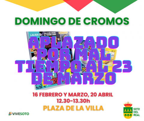 DÍA: 16 febrero y marzo, 20 abril; HORA: 12:30 a 13:30 h; LUGAR: Plaza de la Villa. ¡Domingo de intercambio de cromos en Soto del Real! ¿Tienes cromos repetidos de Pokémon, LaLiga u otras colecciones? ¡Este es el momento de completarlos! Te esperamos el domingo 19 de enero, de 12:30 a 13:30 h, en la […]