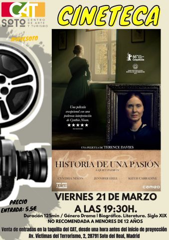 DÍA: 21 de marzo; HORA: 19:30 H; LUGAR: C.A.T. ENTRADAS: 5,5€ en taquilla antes del espectáculo. Biopic de la obra y vida de la gran Emily Dickinson, una poetisa que paso la mayor parte de su vida en casa de sus padres en Amherst, Massachusetts. La mansión en la que vivió sirve de telón de […]