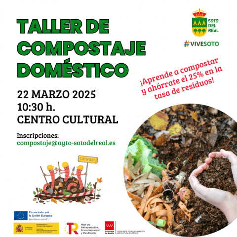 FECHA: Sábado 22 de marzo de 2025 HORA: 10:30 h LUGAR: Centro Cultural INSCRIPCIÓN GRATUITA: compostaje@ayto-sotodelreal.es ¡Plazas limitadas! El Ayuntamiento de Soto del Real te invita a un nuevo taller gratuito de compostaje doméstico, impartido por Marian Lorenzo, especialista en gestión de residuos, en el que los participantes aprenderán a transformar los residuos orgánicos […]