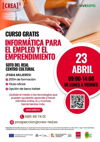 Curso de Capacitación Digital para el empleo y el emprendimiento para mujeres Del 23 de abril al 20 de junio de lunes a viernes de 09:00-14:00 en el Centro Cultural Más información en: https://innova.crea-red.es/contenidos/ Inscripciones: 685 49 74 01 prospeccion@crea-red.es