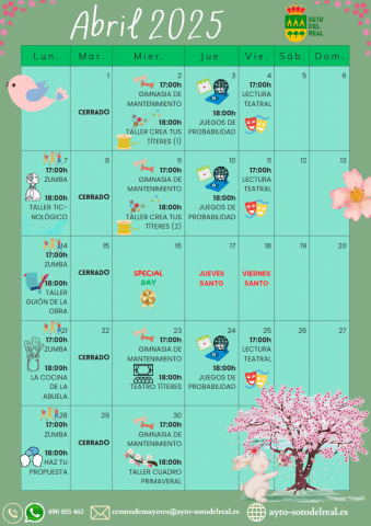 DÍAS: lunes 7, 14, 21 y 28 de abril; HORA: 17:00 h; LUGAR: Centro de Mayores; INSCRIPCIÓN: no es necessaria, admisión libre hasta completar aforo.