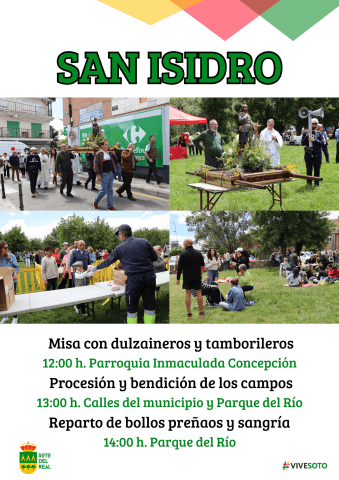 FECHA: jueves 15 de Mayo; HORA: 12:00 MISA con dulzaineros y tamborileros 13:00 PROCESIÓN del Santo con Dulzaineros por las calles del municipio. 13:30 BENDICIÓN DE LOS CAMPOS en el Parque del Río. 14:00 Reparto de Bollos Preñaos y Sangría en el Parque del Río. LUGAR: Soto del Real.