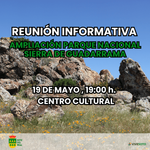 Fecha: lunes 19 de mayo, Hora: 19:00 h. Lugar: Salón de actos del Centro Cultural Contaremos con el director del Parque Nacional de la Sierra de Guadarrama, Pablo Sanjuanbenito, para explicarnos en qué consiste el proyecto de ampliación y poder resolver posibles dudas.