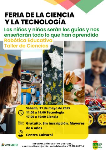 DÍA: 31 DE MAYO; HORA: de 11:00 a 14:00 Tecnología y de 17:00 a 19:00 Ciencia; LUGAR: Centro cultural y aledaños; TIPO DE ACTIVIDAD: Talleres de ciencia y robótica dirigidos por el alumnado de las actividades. Los niños y niñas participantes en los Talleresde Ciencia y Tecnología realizarán Actividades demostrativas de lo que han desarrollado […]