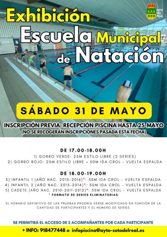 FECHA: S-31 de mayo; HORA: 17:00-20:00 h; LUGAR: Complejo Deportivo Prado Real (Piscina Cubierta); INSCRIPCIÓN: Inscripciones hasta el 25 de mayo en la Piscina Cubierta o a través del correo infopiscina@ayto-sotodelreal.es Exhibición de la Escuela Municipal de Natación en categorías desde Benjamín (Nivel VERDE) a Cadete. Se realizará por turnos según categorías y edades, permitiendo […]