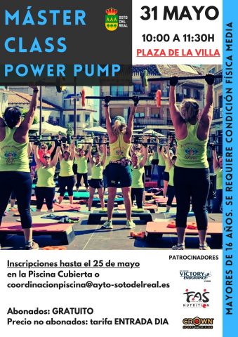 FECHA: S-31 de mayo; HORA: 10-11:30 h; LUGAR: Plaza de la Villa; PÚBLICO: Deportistas mayores de 16 años. Se requiere condición física media; INSCRIPCIÓN: Inscripción previa obligatoria, hasta el 25 de mayo (o agotar plazas), en la Piscina Cubierta o a través del correo infopiscina@ayto-sotodelreal.es PLAZAS LIMITADAS Máster Class dirigida por monitora que servirá como […]