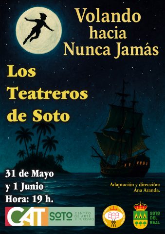 FECHA: 31 de Mayo y 1 de Junio HORA: 19:00 h; LUGAR: C.A.T. TÍTULO DEL EVENTO: VOLANDO HACIA NUNCA JAMÁS. Cía Los Teatreros de Soto (Asociación Chozas de la Sierra) TIPO DE ACTIVIDAD: Teatro aficionado infantil. PÚBLICO: familiar; ENTRADAS: 3€ en mutick.com