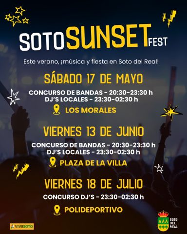 INSCRIPCIONES: A través del correo juventud@ayto-sotodelreal.es y en la casa de la juventud de manera presencial en el horario de apertura. PÚBLICO: mayores de 16 años. El Ayuntamiento de Soto del Real presenta con entusiasmo la primera edición del Soto Sunset Fest, un festival musical con sabor local que reunirá a bandas emergentes, DJs noveles […]