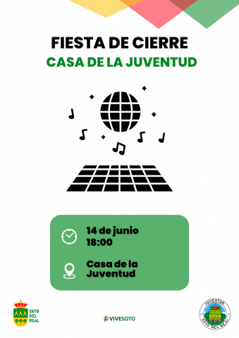 DÍA: 14 de junio; HORA: 18 h; LUGAR: Casa de la Juventud; PÚBLICO: 11 a 17 años; Despedimos el curso con una gran fiesta de cierre en la Casa de la Juventud. Habrá música, merienda, juegos, actividades especiales, premios a los participantes más activos del año, y un espacio para compartir recuerdos y fotos.