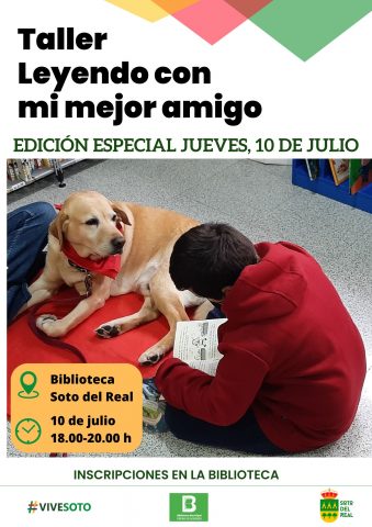 TÍTULO DEL EVENTO: Leyendo con mi mejor amigo, con Asociación Perros y Letras TIPO DE ACTIVIDAD: Taller de animación a la lectura FECHA: Jueves 10 de julio HORA: 18:00 -20:00 h LUGAR: Biblioteca