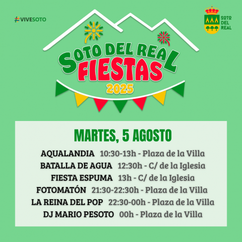Aqualandia: tobogán Splash e hinchables con agua - 10:30-13:00 h. Plaza de la Villa. Batalla de pistolas y globos de agua - 12:30 h. Calle de la Iglesia. Fiesta infantil de la espuma - 13:00 h. Calle de la Iglesia. Fotomatón - 21:30 - 22:30 h. Plaza de la Villa. Ven con tu peña, familia […]