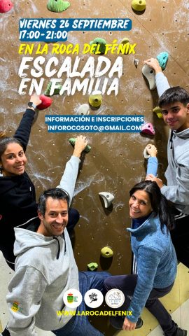 Reto ESCALADA EN FAMILIA (dentro de la SED 2025) FECHA: V-26 Sept. HORA: 17h- 21h (tendremos diferentes turnos de participación); LUGAR: rocódromo LA ROCA DEL FÉNIX INSCRIPCIONES: Imprescindible inscripción a través del enlace INSCRIPCIONES RETOS DE ESCALADA EN FAMILIA 2025 Información y reservas: inforocosoto@gmail.com