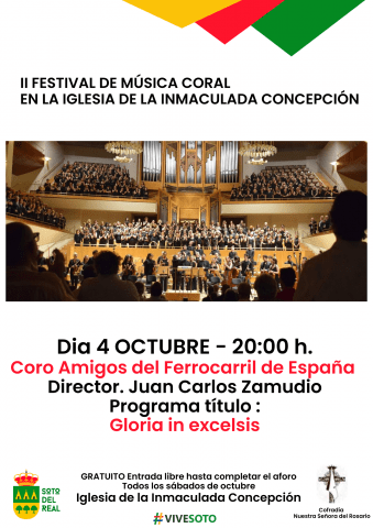 II FESTIVAL DE MÚSICA CORAL VIRGEN DEL ROSARIO FECHA: 4/10/2025 HORA: 20:00 h; LUGAR: Iglesia de la Inmaculada Concepción Coro Amigos del Ferrocarril de España Director. Juan Carlos Zamudio Programa título : “Gloria in excelsis”