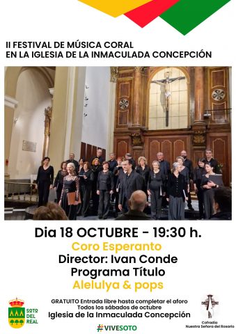 II FESTIVAL DE MÚSICA CORAL VIRGEN DEL ROSARIO FECHA: 18/10/2025; HORA: 19:30 h; LUGAR: Iglesia de la Inmaculada Concepción. Coro Esperanto Director: Ivan Conde Programa Título: Alelulya & pops