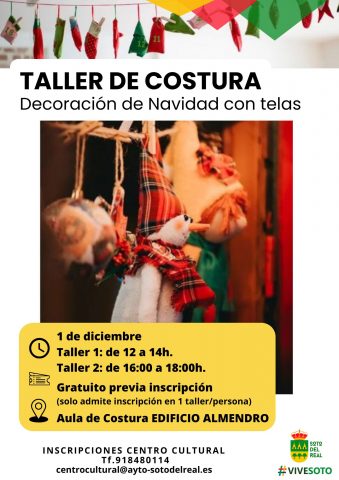 Taller de costura FECHA: 1 de diciembre; HORA: dos talleres: matutino, de 12:00 a 14:00 h; vespertino, de 16:00 a 18:00 h; LUGAR: Aula Costura - Edificio Almendro. GRATUITO previa INSCRIPCIÓN en Centro Cultural (únicamente se puede solicitar uno de los talleres). Aprenderemos a realizar decoración navideña para el hogar utilizando la costura y telas […]