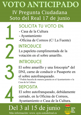 A parte de la votación presencial el 17 de junio, el Ayuntamiento pone a disposición de los vecinos un voto anticipado en la Oficina de Correos, Ayuntamiento y Casa de la Cultura.