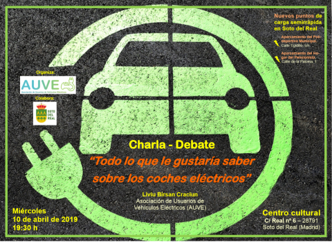 La Asociación de Usuarios de Vehículos Eléctricos (AUVE) organiza una charla debate sobre vehículos eléctricos este miércoles, 10 de abril, en Soto del Real. “Todo lo que te gustaría saber sobre los coches eléctricos”, tiene el objetivo de resolver todas las dudas de los vecinos de la comarca en torno a vehículos cero y de bajas emisiones, con el objetivo de fomentar la apuesta por el transporte privado sostenible.