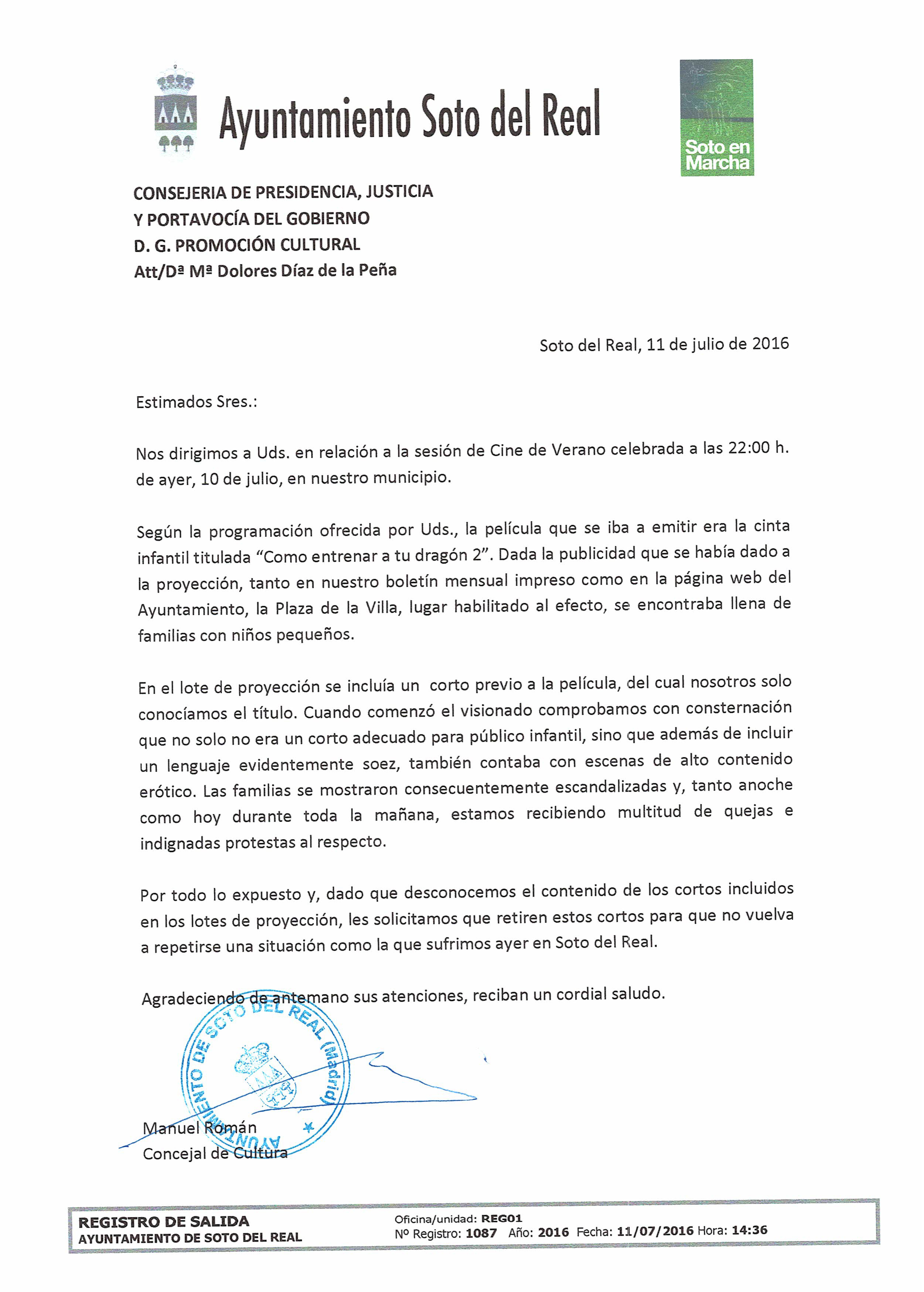 El Ayuntamiento, considerando que el argumento de dicho cortometraje no era el indicado para proyectar antes de una película infantil, realizó, el lunes 11 de julio, una reclamación por escrito a la Comunidad de Madrid, organizadora de dichas proyecciones.