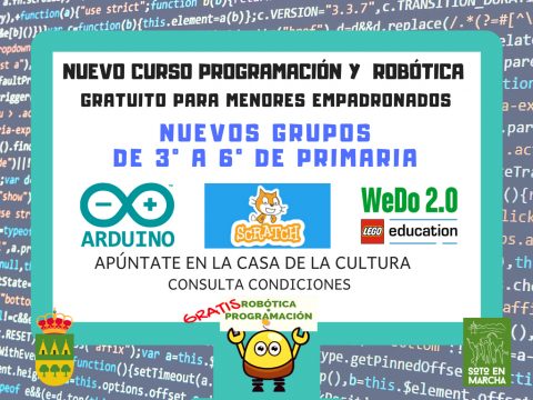 El equipo de gobierno, consciente de la necesidad de que los niños empiecen a estudiar estas materias antes de comenzar los estudios de la ESO, ha decidido financiar a todos los niños de 3º,4º,5º y 6º empadronados en Soto del Real (con más de 3 meses de antigüedad), las materias de robótica y programación.