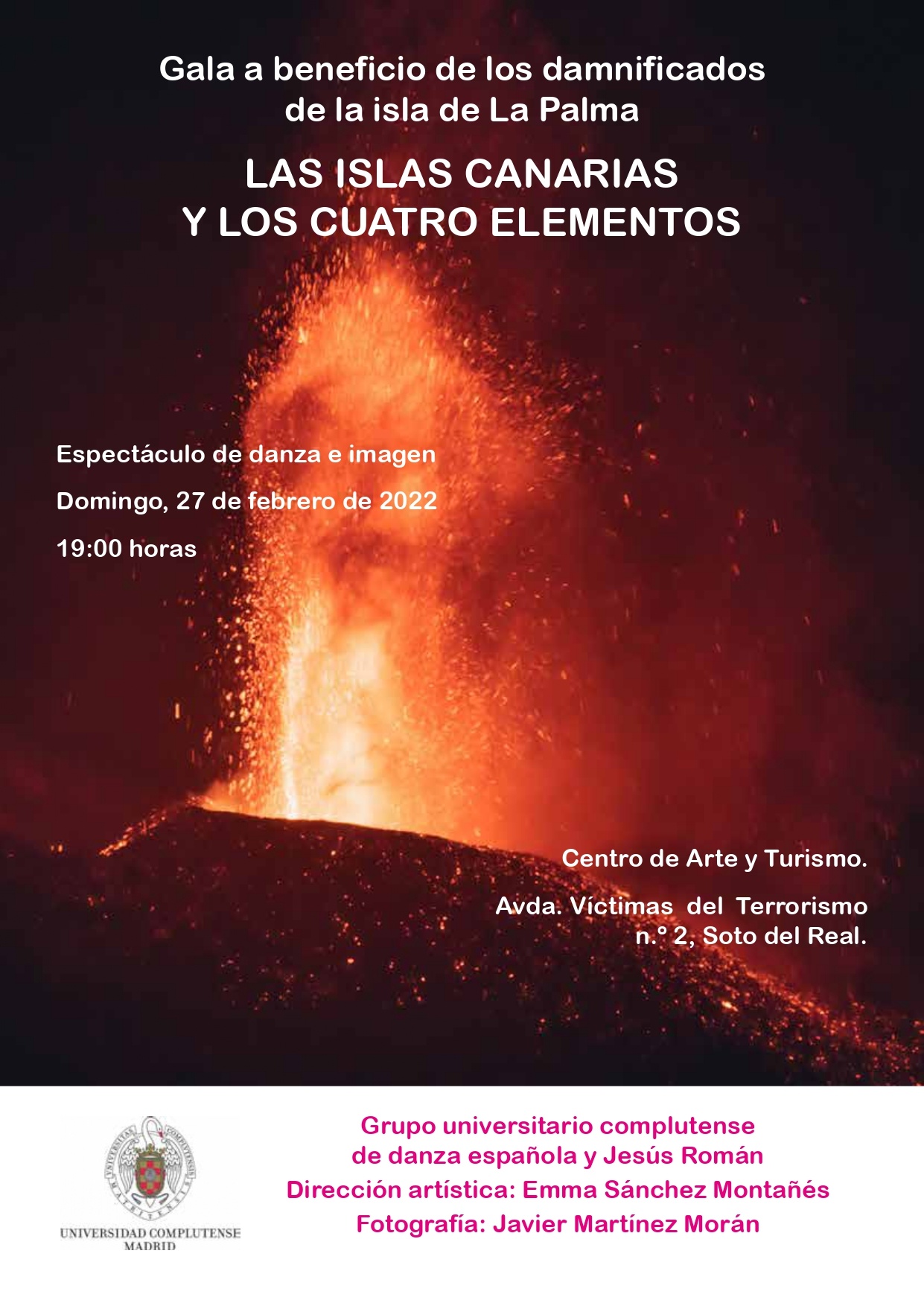 El 27 de febrero, a las 19 horas en el Centro de Arte y Turismo (CAT), el Grupo Complutense de Danza Española y Jesús Román, bajo la dirección artística de Emma Sánchez Montañés, vecina de Soto, que mostrarán su talento sobre el escenario por esta buena causa. “Las Islas Canarias y los Cuatro Elementos” será un espectáculo de danza sobre fotografías de Javier Martínez Morán.