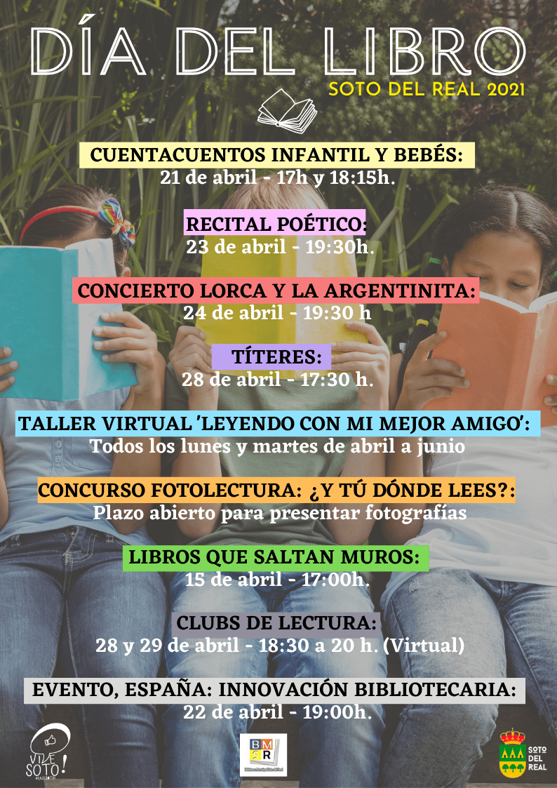 Además, a lo largo del mes, la biblioteca de Soto continúa con actividades culturales relacionadas con la lectura como son: el taller virtual “Leyendo con mi mejor amigo” todos los lunes y martes de abril a junio; el concurso Fotolectura: ¿y tú dónde lees?, cuyo plazo está abierto para presentar fotografías; la actividad “Libros que saltan muros” el jueves 15 de abril en el Centro Penitenciario Madrid V; una sesión presencial muy especial de Biblioterapia para mayores que tendrá lugar el 23 de abril con mayores de la residencia Sotofresnos y voluntarios del proyecto; dos sesiones del club de lectura virtual los días 28 y 29 de abril; y el evento online ‘España: Innovación bibliotecaria’ en el que participará la biblioteca de Soto el jueves 22 de abril.