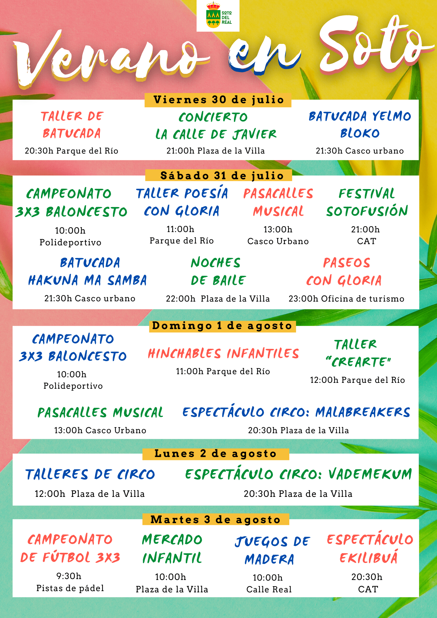 Tras el éxito del verano pasado, de nuevo habrá espectáculos de calle con temática circense para familias con la II Edición del Festival Cirqueando; conciertos al aire libre y pasacalles en el casco urbano siguiendo el estilo SorpreSoto; actividades y torneos deportivos; talleres artísticos infantiles al aire libre en la naturaleza; y la I edición del Festival #SOTOfusión 2021, una experiencia artística con Antonio Lizana, Patax y Alain Pérez en el CAT.