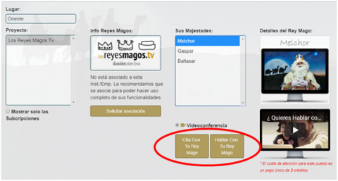 - Y solicitar la videoconferencia con el Rey elegido, pidiendo cita previa (Botón “Cita con tu Rey Mago”) o atención inmediata (Botón “Hablar con tu Rey Mago”):