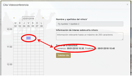 - Si la cita es una petición de cita previa (Botón “Cita con tu Rey Mago”) hay que rellenar el siguiente formulario que es muy parecido al anterior pero en el que hay que elegir día y hora de la cita seleccionándolo en el calendario de la izquierda: