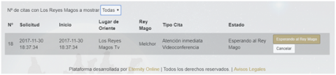 - Una vez solicitada la cita, aparece en la parte inferior de la sección de Inicio con el estado “Esperando al Rey Mago”: